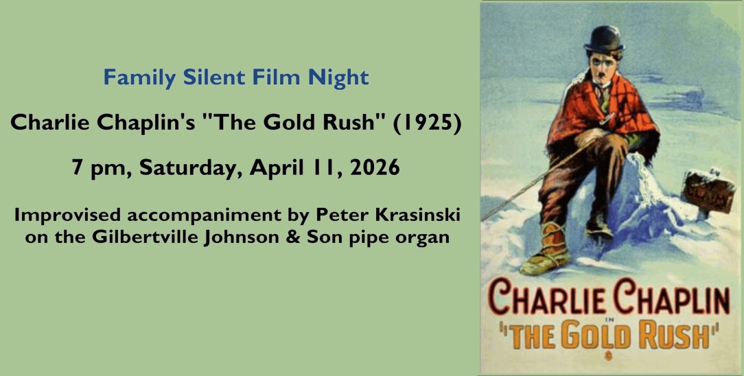 Friends of the Stone Church present our ninth Silents Are Golden concert featuring Charlie Chaplin’s “The Gold Rush” (1925) with live improvised accompaniment by organist Peter Krasinski on the Gilbertville Johnson & Son pipe organ.
