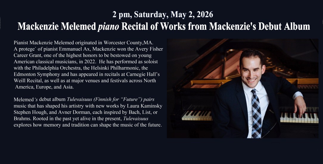 Pianist Mackenzie Melemed originated in Worcester County, MA. A protegé of pianist Emmanuel Ax, in 2022 Mackenzie won the Avery Fisher Career Grant, one of the highest honors to be bestowed on young American classical musicians. He has performed as soloist with the Philadelphia Orchestra, the Helsinki Philharmonic, the Edmonton Symphony, the Polish Radio Orchestra, and other prominent ensembles, and has appeared in recitals at Carnegie Hall’s Weill Recital, as well as at major venues and festivals across North America, Europe and Asia.